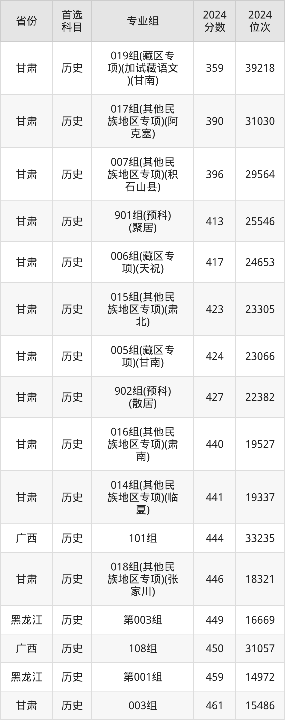 历史类:003组461分、15486名,005组(藏区专项)(甘南)424分、23066名,006组(藏区专项)(天祝)417分、24653名,007组(其他民族地区专项)(积石山县)396分、29564名,009组467分、14423名,010组467分、14423名,011组(建档立卡专项)470分、13863名,013组(建档立卡专项)467分、14423名,014组(其他民族地区专项)(临夏)441分、19337名,015组(其他民族地区专项)(肃北)423分、23305名,016组(其他民族地区专项)(肃南)440分、19527名,017组(其他民族地区专项)(阿克塞)390分、31030名,018组(其他民族地区专项)(张家川)446分、18321名,019组(藏区专项)(加试藏语文)(甘南)359分、39218名,901组(预科)(聚居)413分、25546名,902组(预科)(散居)427分、22382名;