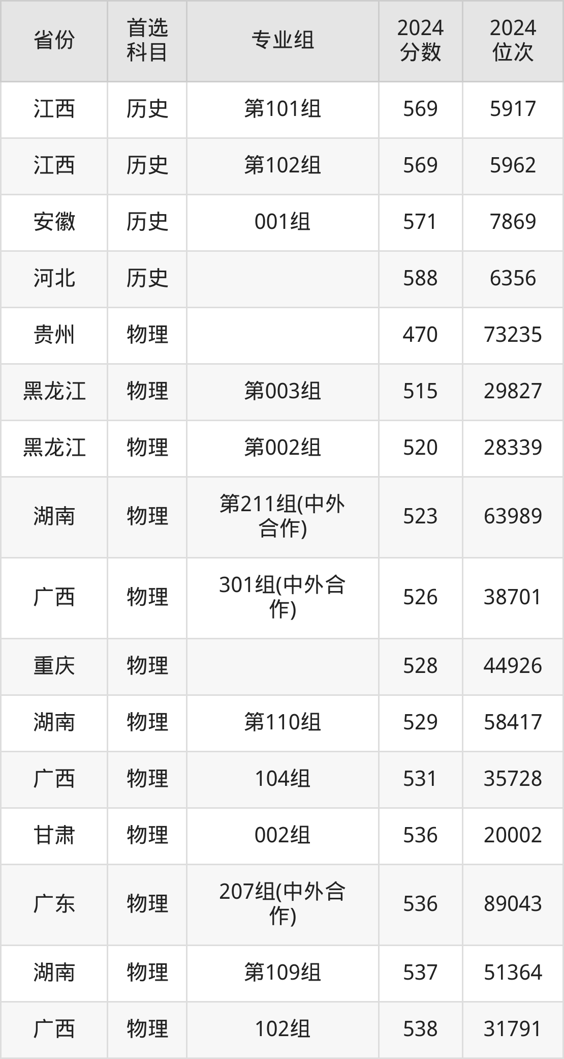 物理类最低分对应地区为贵州,录取位次为73235,超本科线90分;最高分对应地区为福建(专业组:500),录取位次为25615,超本科线129分。