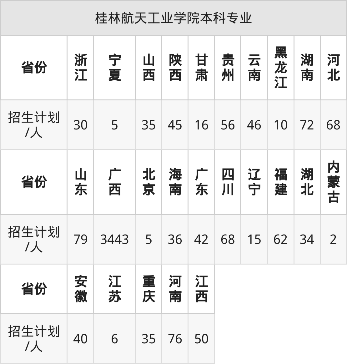 桂林航天工业学院面向广西(3443人)、江苏(6人)、湖北(34人)、海南(36人)、黑龙江(10人)、广东(42人)、甘肃(16人)等25个地区开展本科招生。其中山东招生批次为一段,四川、河南、内蒙古、陕西招生批次为本科二批,其余省份为本科批。