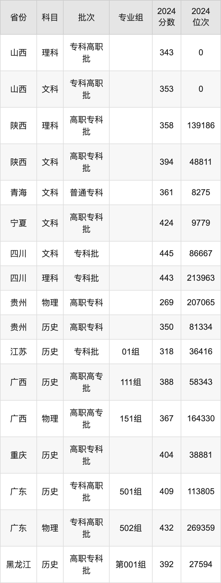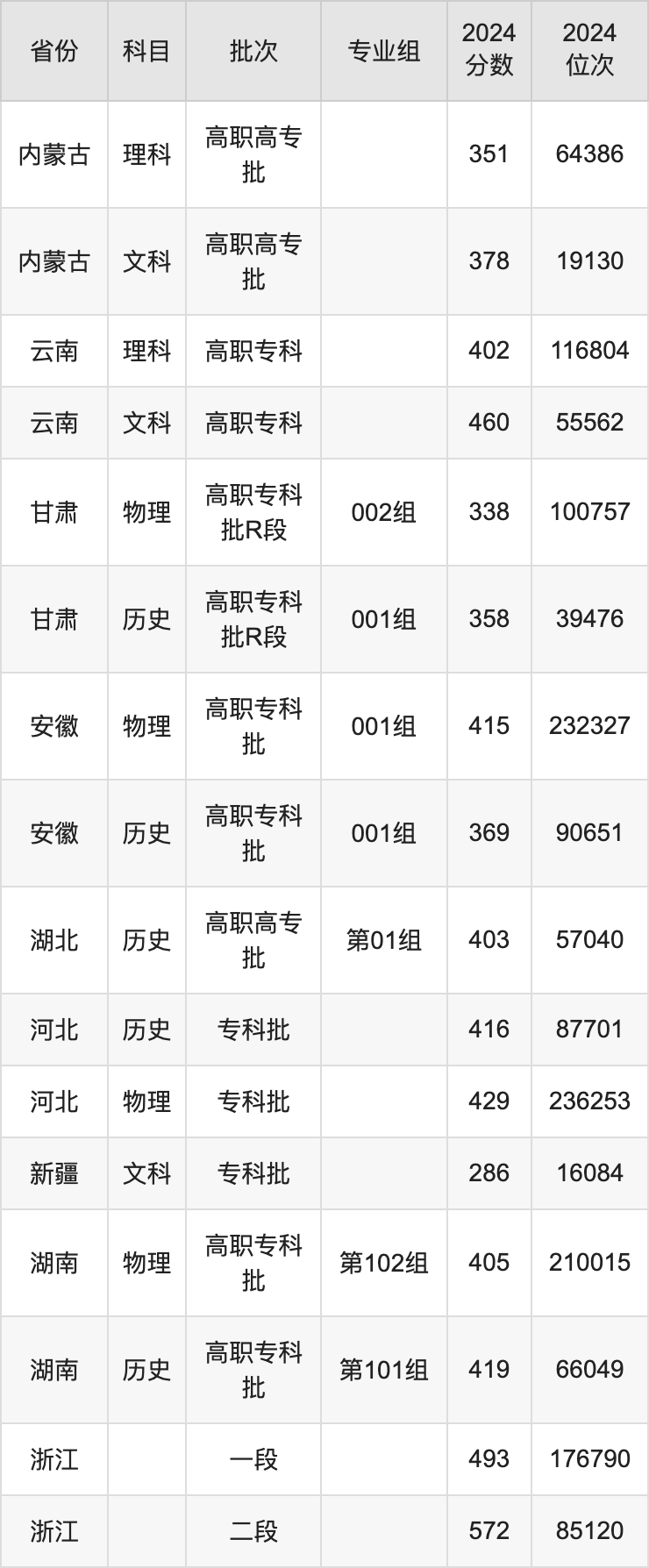 2024年在专科历史类进行招生,各专业组分数线详情如下: