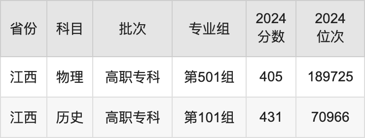 江西中医药高等专科学校001组:2024年投档录取最低分为415分,录取最低位次为232327名。