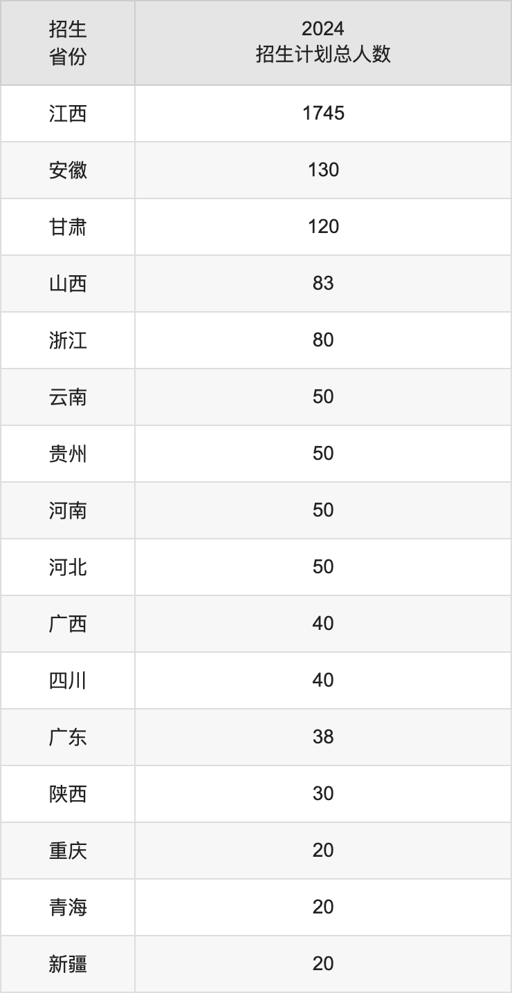 2024年江西中医药高等专科学校面向全国25个省市开展专科招生;招生专业共19个,招生人数共2679人。其中,江西中医药高等专科学校在江西省招生人数最多的是护理,2024年在江西省招生计划总人数是1745人。江西中医药高等专科学校在各省具体招生人数情况如下表。