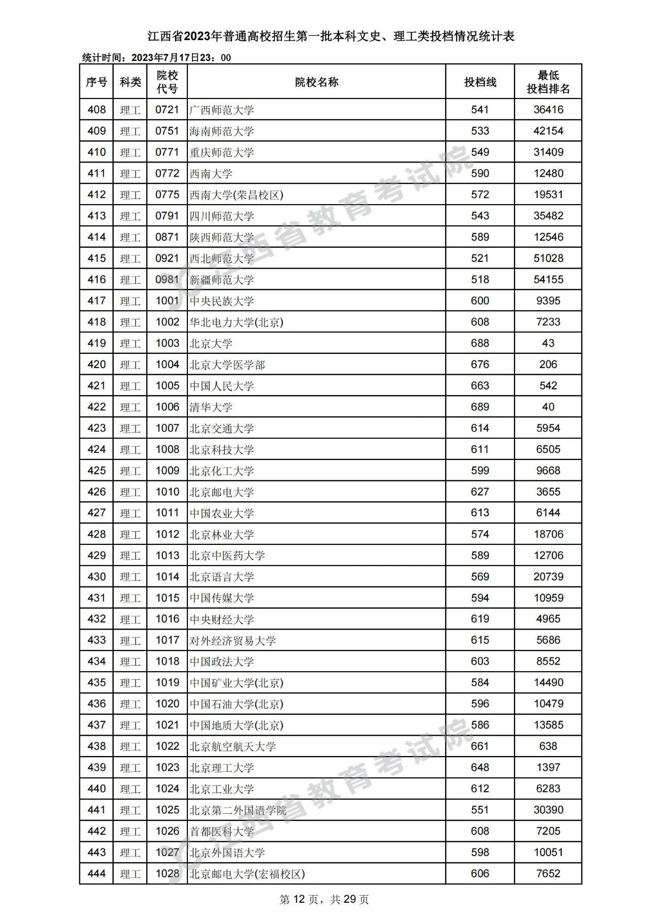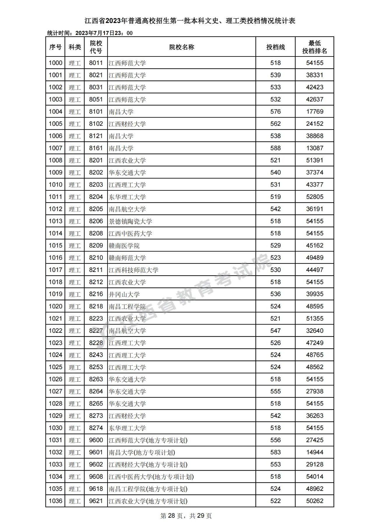 2023江西普通高校招生第一批文史、理工类投档情况统计表